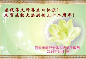 陕西省西安南郊全体大法弟子恭祝伟大师尊生日快乐!庆贺法轮大法洪传三十二周年!