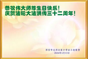 陕西省西安西郊一学法小组大法弟子恭祝伟大师尊生日快乐!庆贺法轮大法洪传三十二周年!