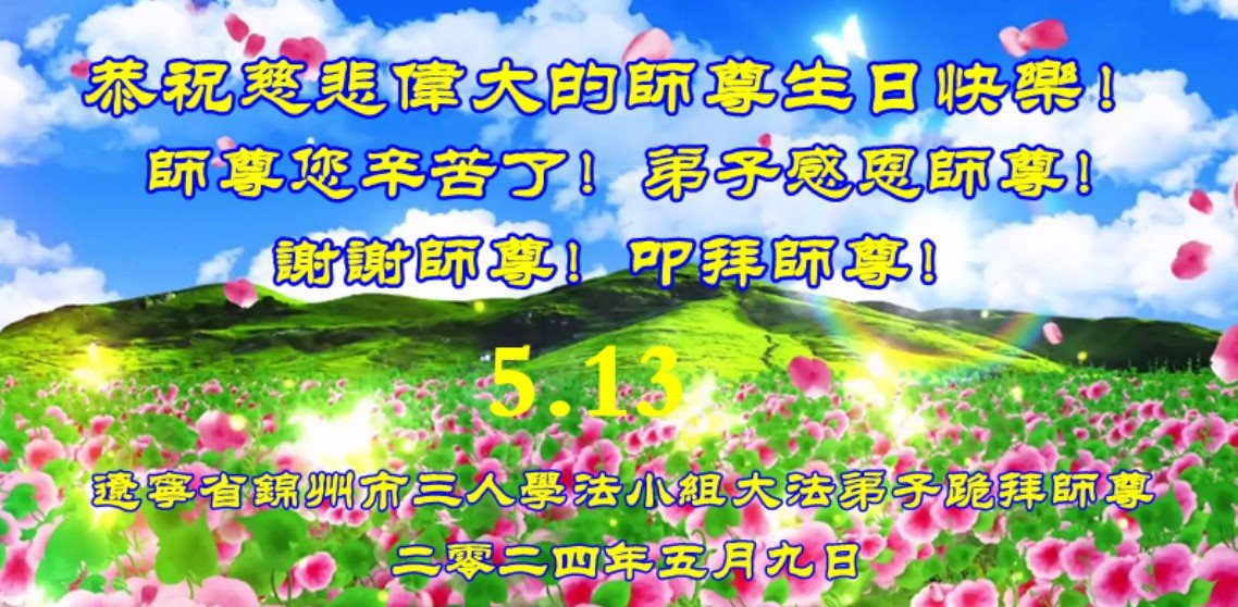 又到了2024年5·13了,弟子们怀着感恩激动的心情,恭祝慈悲伟大的师尊生日快乐!弟子定勤勉,精進,随师还。 辽宁省锦州市三人学法小组大法弟子恭祝慈悲伟大的师尊生日快乐!
