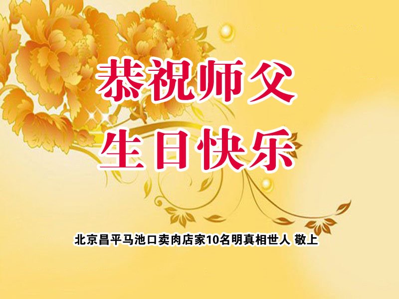 北京昌平马池口卖肉店家10名明真相世人祝师父生日快乐! 北京昌平马池口一大法弟子携全家10人恭祝师尊生日快乐!