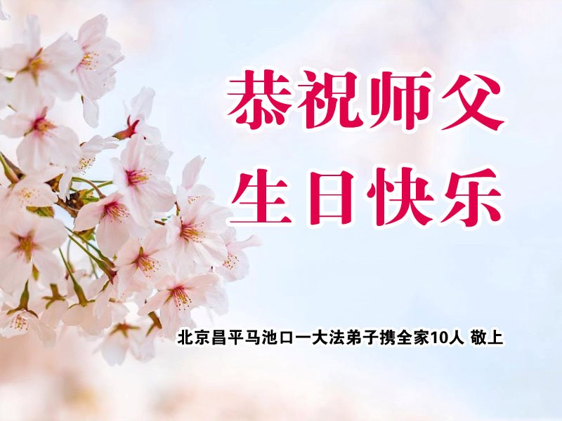 普天同庆五一三到来。 衷心祝愿我们的师尊生日快乐! 感恩师尊慈悲救度众生, 得救的众生恭祝师尊生日快乐! 愿弟子都能圆满随师还! 北京昌平马池口一大法弟子携全家10人恭祝师尊生日快乐! 北京怀柔一明真相百姓恭祝师父生日快乐!