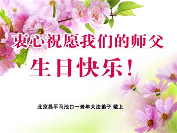 祝师父生日快乐! 弟子盼望师父早日回来,弟子不能让师父操心,我要更精進实修!多学法,多救人。 北京昌平南口一老年大法弟子敬上 北京昌平马池口100名明真相世人恭祝师父生日快乐!