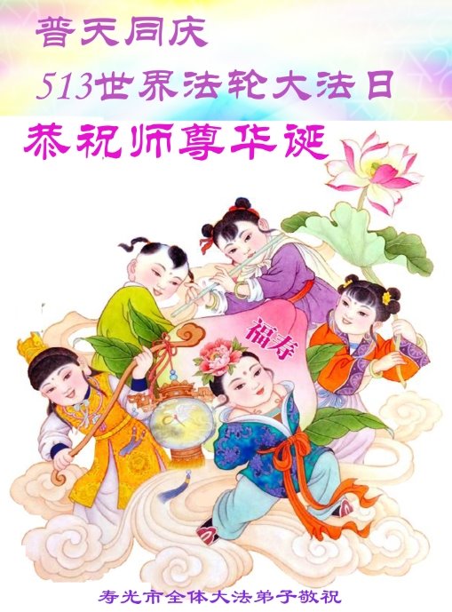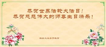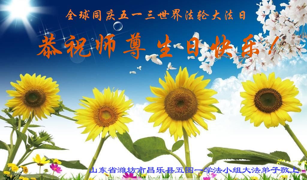 祝贺五一三世界法轮大法日! 谢谢师尊的慈悲苦度! 山东省诸城市一夫妻同修敬上 山东潍坊大法弟子全家六口恭祝师尊华诞!