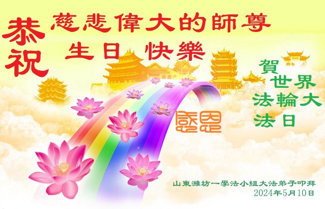 【明慧网二零二四年五月十三日】 山东潍坊一学法小组大法弟子恭祝慈悲伟大的师尊生日快乐!