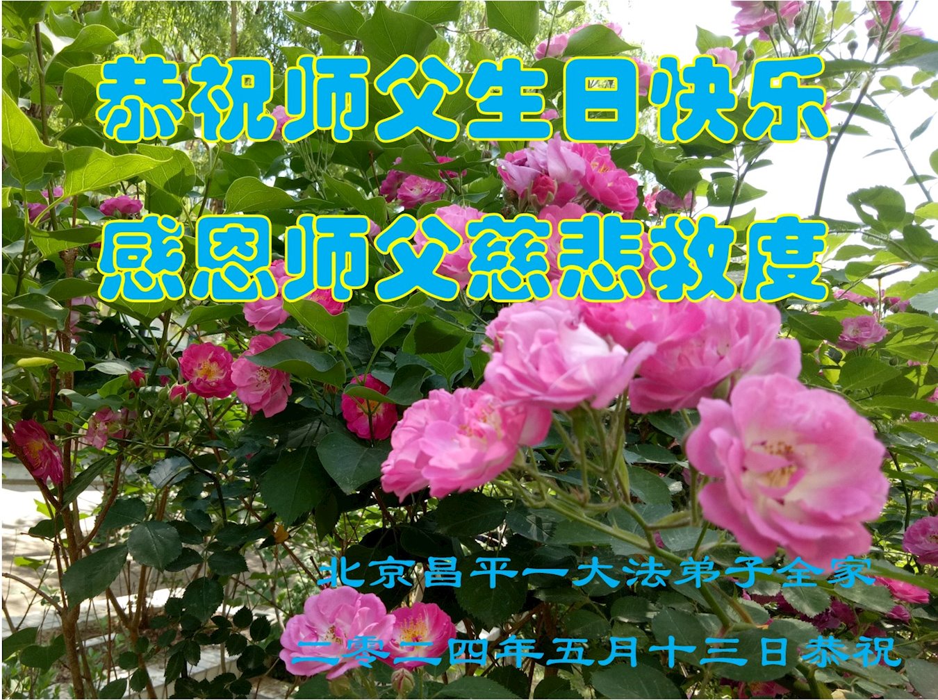 北京昌平一大法弟子全家恭祝师父生日快乐! 五月十三日是世界法轮大法日,也是伟大慈悲的师父的生日,弟子全家恭祝师父生日快乐! 在法轮大法中修炼的这些年,我真真切切的感受到了大法的神奇与殊胜。我沐浴在大法的光辉里,无比的喜乐、无比的幸福。修炼中,师父不断的给我净化身体、净化身体。从修炼前身体的污浊、沉重,到现在的纯净、轻盈。 千言万语道不尽师父对我的保护,今后我要更加坚定正念,多学法、学好法,做好三件事,完成大法弟子的使命与责任。感恩师父的慈悲救度! 北京昌平一大法弟子全家敬上 二零二四年五月十一日 北京昌平一大法弟子恭祝师尊生日快乐!