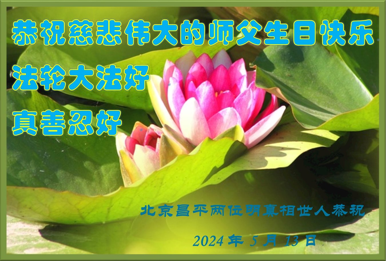 北京昌平两位明真相世人恭祝师父生日快乐! 恭祝慈悲伟大的师父生日快乐! 法轮大法好,真善忍好。 北京昌平两位明真相世人敬上 二零二四年五月十一日 北京昌平马池口大法弟子恭祝师父生日快乐!