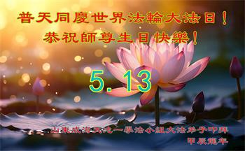 【明慧网二零二四年五月十三日】 山东省烟台市莱阳市一学法小组全体大法弟子敬贺世界法轮大法日暨师尊华诞!