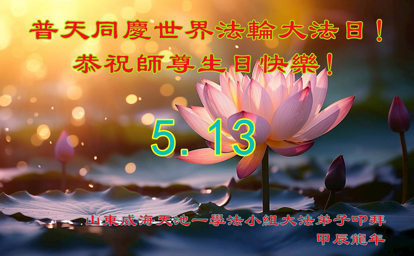 恭祝慈悲伟大的师尊生日快乐!普天同庆5.13世界法轮大法日! 山东省威海市石岛东山三十八位大法弟子敬上 二零二四年五月十日 山东省泰安市两个学法小组大法弟子恭祝法轮大法洪传三十二周年暨慈悲伟大的师尊华诞!