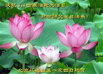 北京怀柔山区一家四口祝贺师父生日快乐!庆祝5∙13世界法轮大法日!
