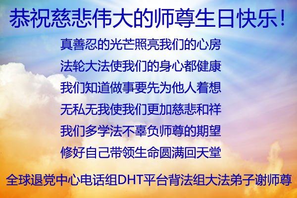 恭祝慈悲伟大师尊生日快乐! 全球.退:党!中心电话组DHT平台全体大法弟子敬上 全球.退:党!中心电话组DHT平台学法房间全体大法弟子恭祝师尊生日快乐!