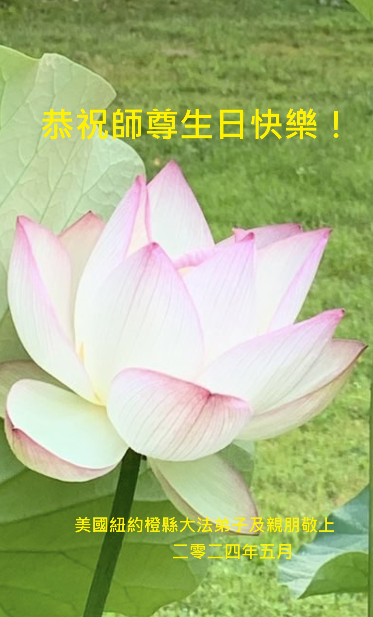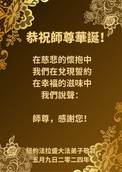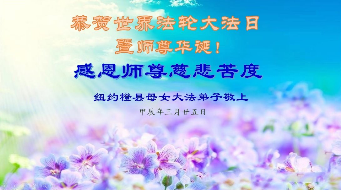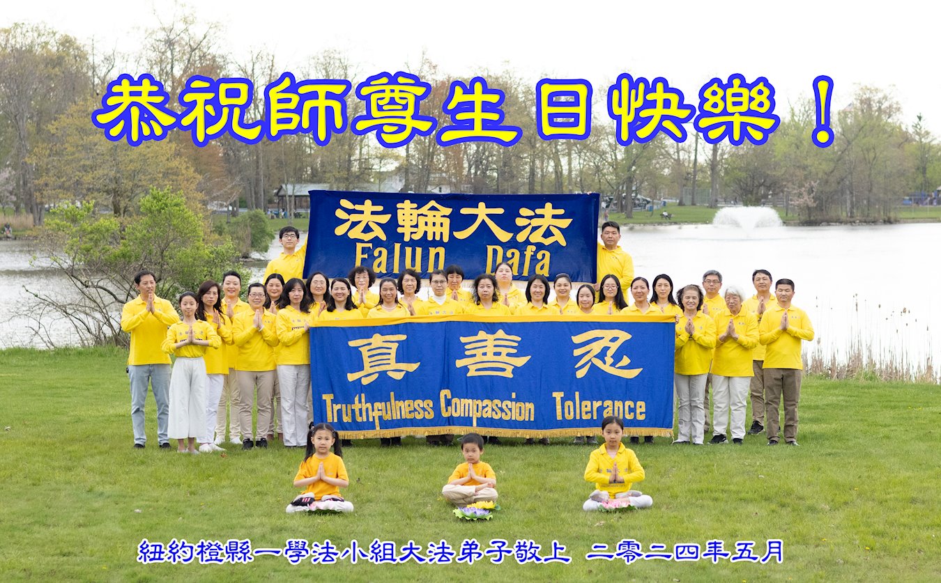 恭贺世界法轮大法日暨师尊华诞! 感恩师尊慈悲苦度 珍惜这万古不遇机缘 长春在纽约母女大法弟子叩拜 2024年5月6日 纽约橙县一学法小组大法弟子恭祝师尊生日快乐!