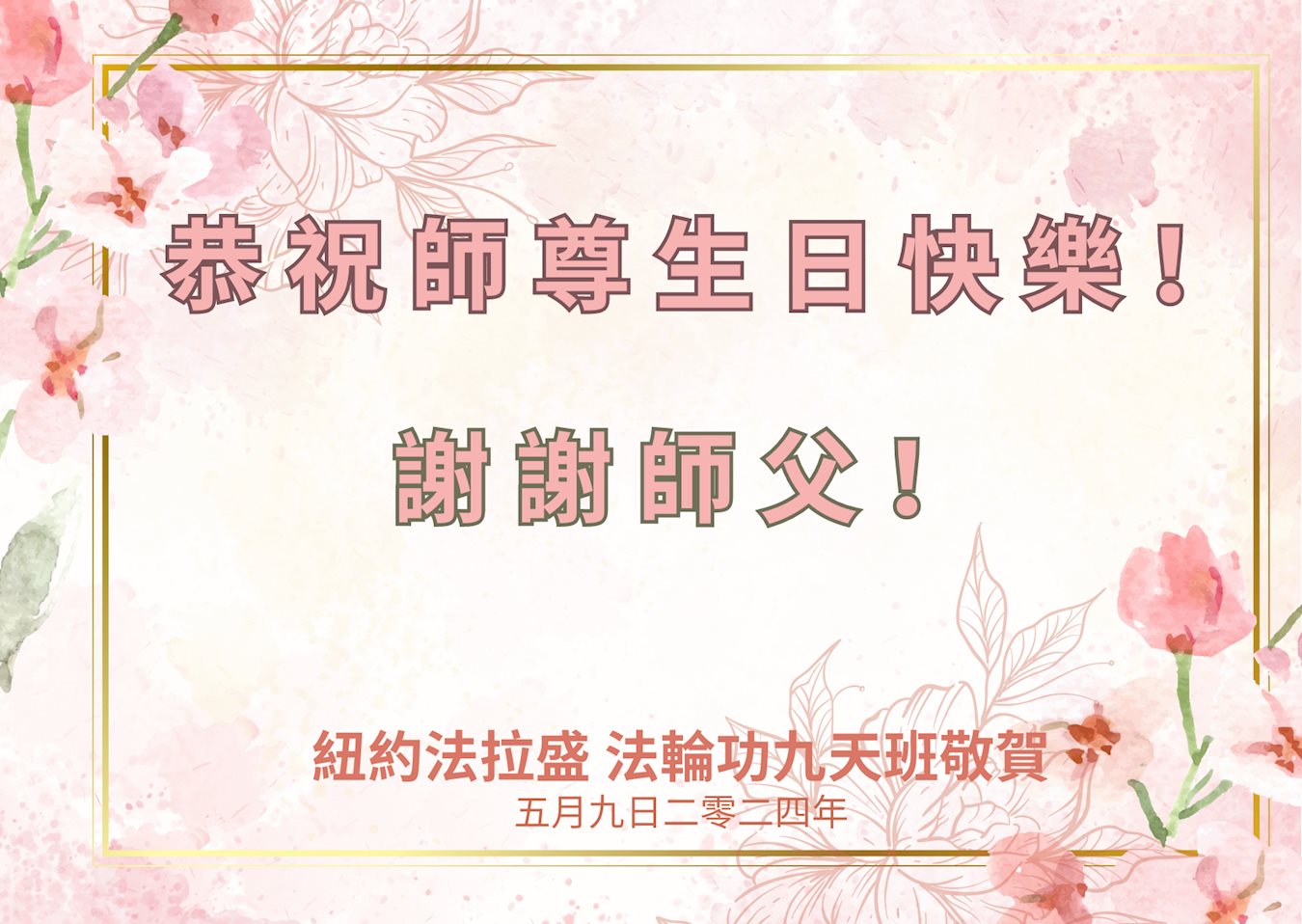 恭祝慈悲伟大师尊生日快乐!普天同庆世界法轮大法日! 任何人类的语言都无法描述师父对众生的付出与慈悲救度,师父辛苦了,恭祝师父生日快乐!弟子们会越做越好,不辜负师尊慈悲救度,完成使命,跟师父回家。 纽约青年大法弟子敬上 二零二四年五月九日 纽约法拉盛法轮功九天班对方的这些敬贺法轮大法日!恭祝师尊生日快乐!谢谢师父!