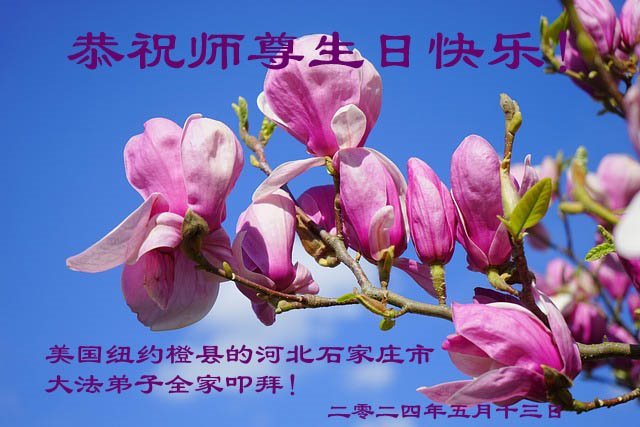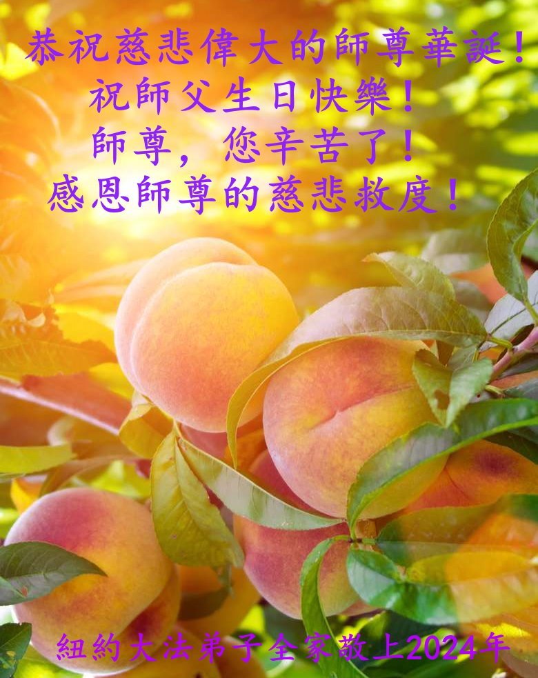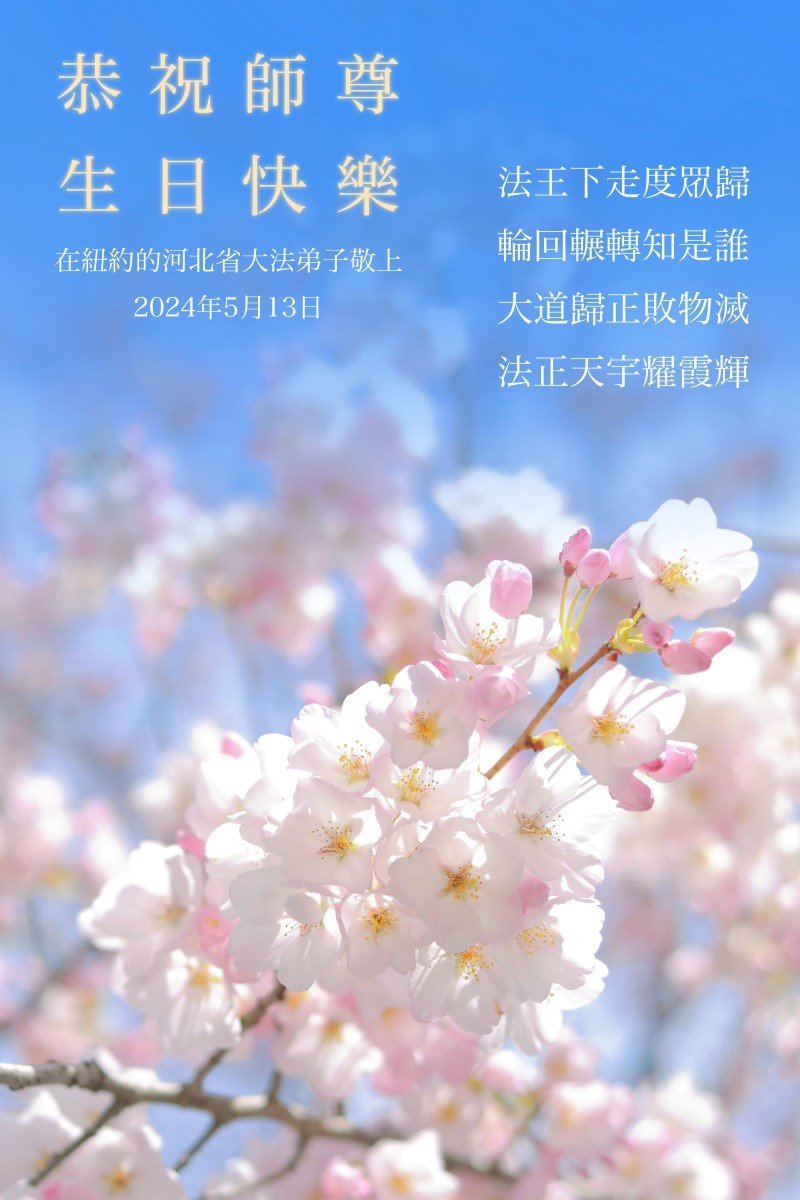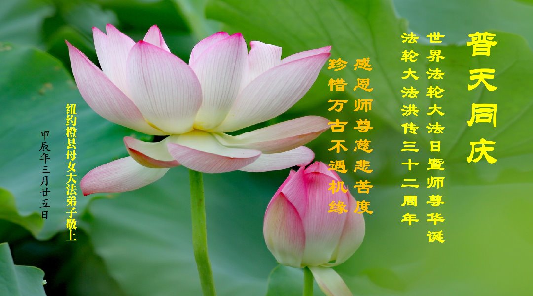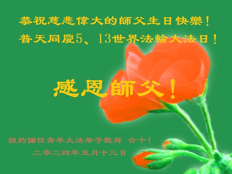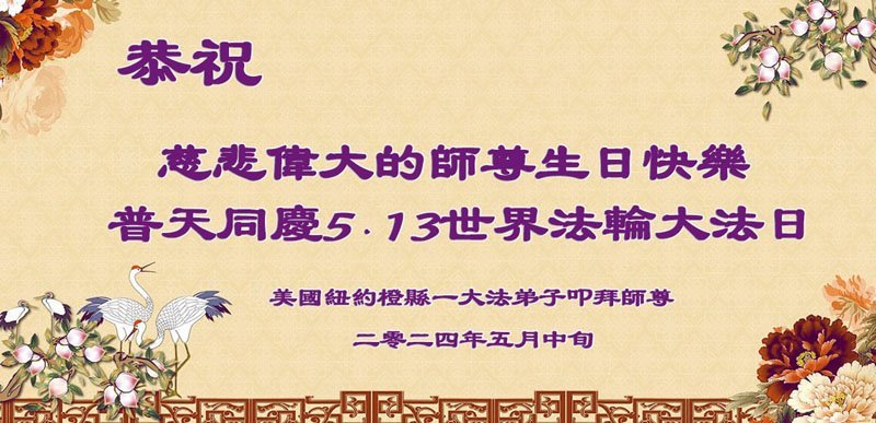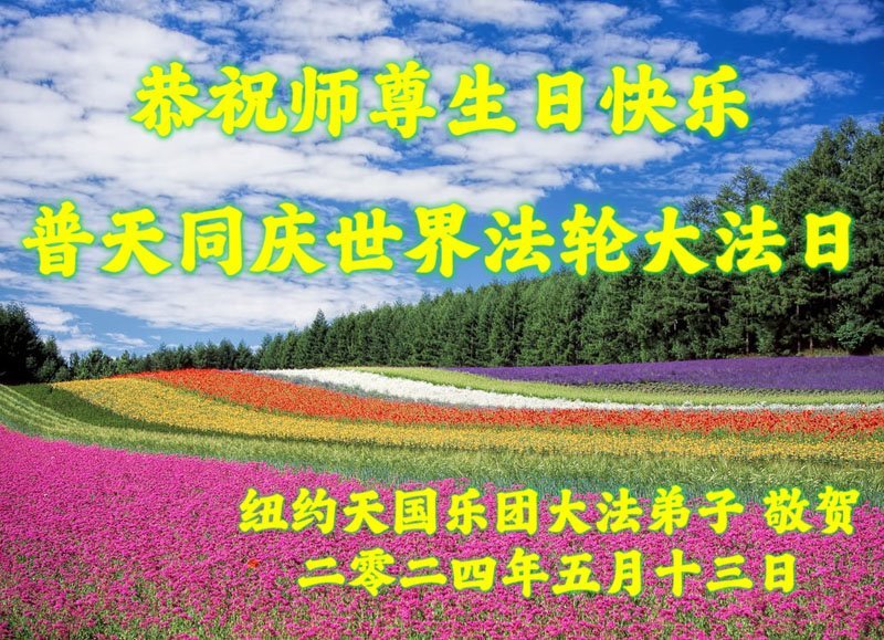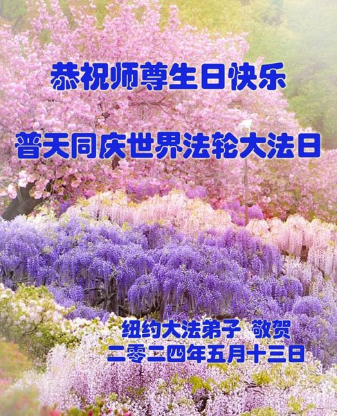 在这天上人间普天同庆的节日里,恭祝师尊生日快乐!恭贺世界法轮大法日! 感恩师尊慈悲苦度,珍惜这万古不遇机缘。 纽约橙县母女大法弟子叩拜 2024年5月5日 美国纽约大法弟子恭祝师尊生日快乐!感恩师尊慈悲救度!
