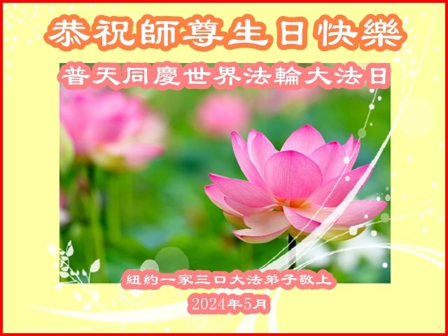 感恩师尊慈悲救度!弟子们谨遵师父教诲,精進不怠,救度众生。 纽约大法弟子全家恭贺师尊华诞!