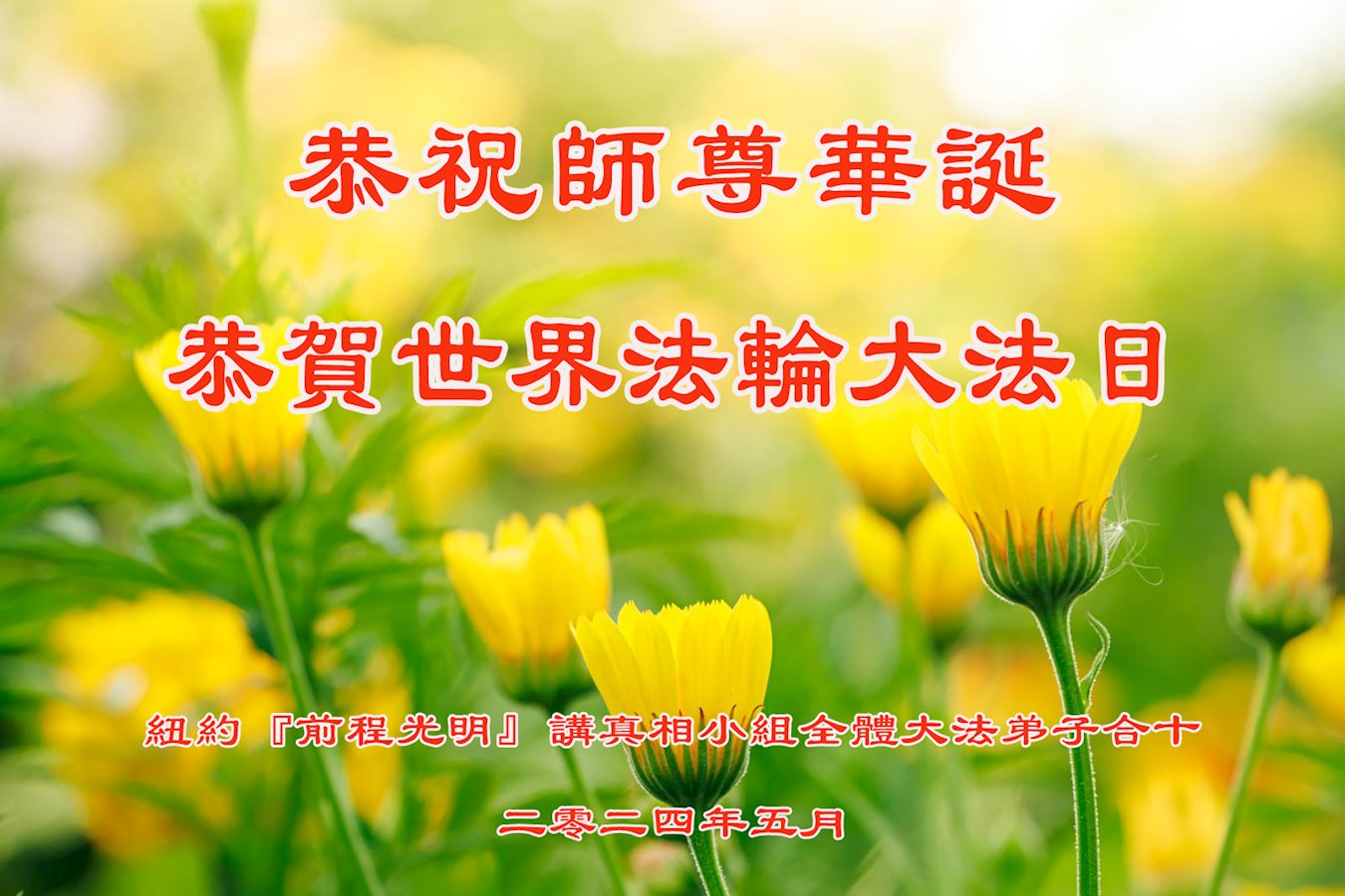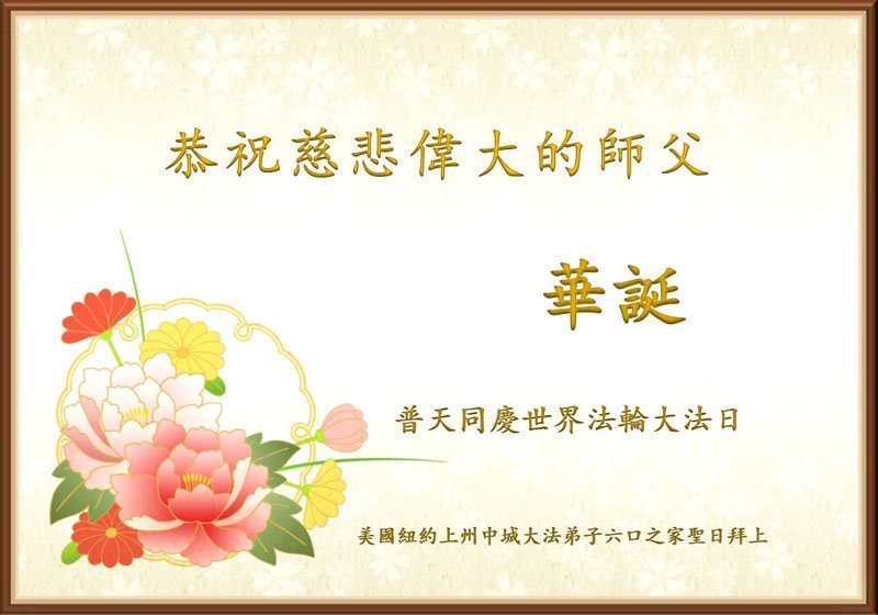 纽约法拉盛法轮功九天班大法弟子敬上 纽约上州中城大法弟子恭祝慈悲伟大的师父华诞暨世界法轮大法日!