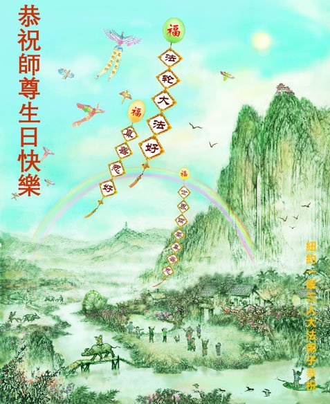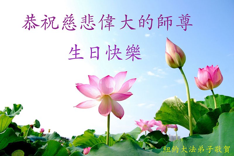 在这普天同庆的日子里,无限感激师父的慈悲苦度!弟子一定忍苦精進,做好三件事,兑现誓约。 美国纽约法拉盛大法弟子恭祝慈悲伟大的师尊生日快乐!