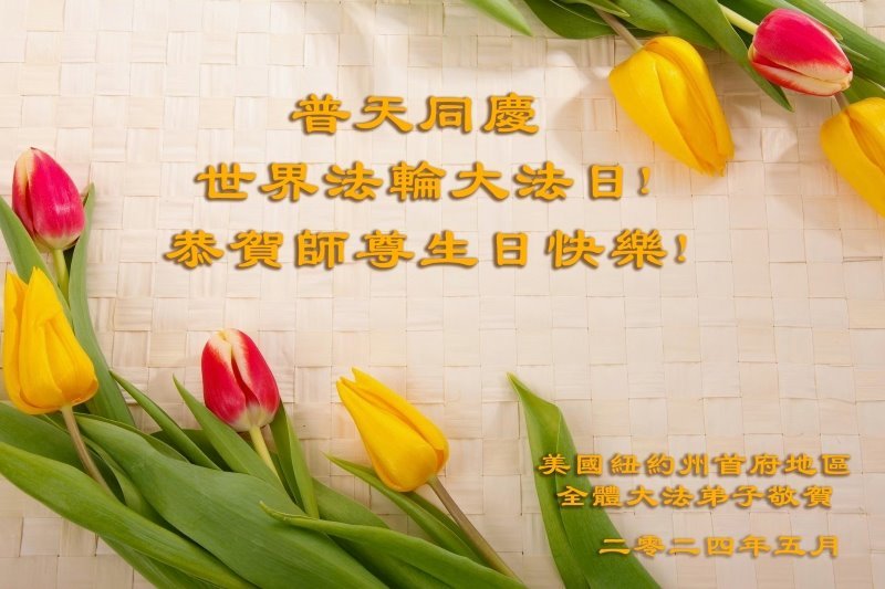 普天同庆五·一三世界法轮大法日!恭祝慈悲伟大的师父生日快乐!师父您辛苦了!弟子们感恩师父的慈悲救度! 美国纽约州首府地区全体大法弟子合十敬上 二零二四年五月六日 美国纽约青年大法弟子敬贺法轮大法日!谢师恩!惟愿师尊悦!