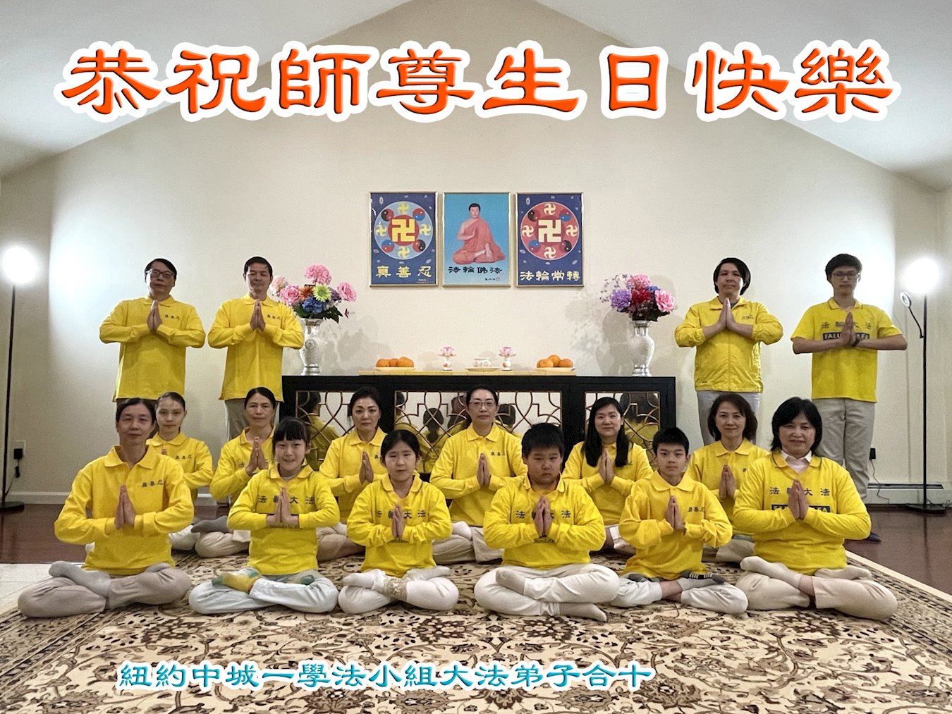 恭祝慈悲伟大的师尊生日快乐! 纽约中城一学法小组大法弟子敬上 纽约飞天大学中城分校一学法小组大法弟子恭祝师尊生日快乐!