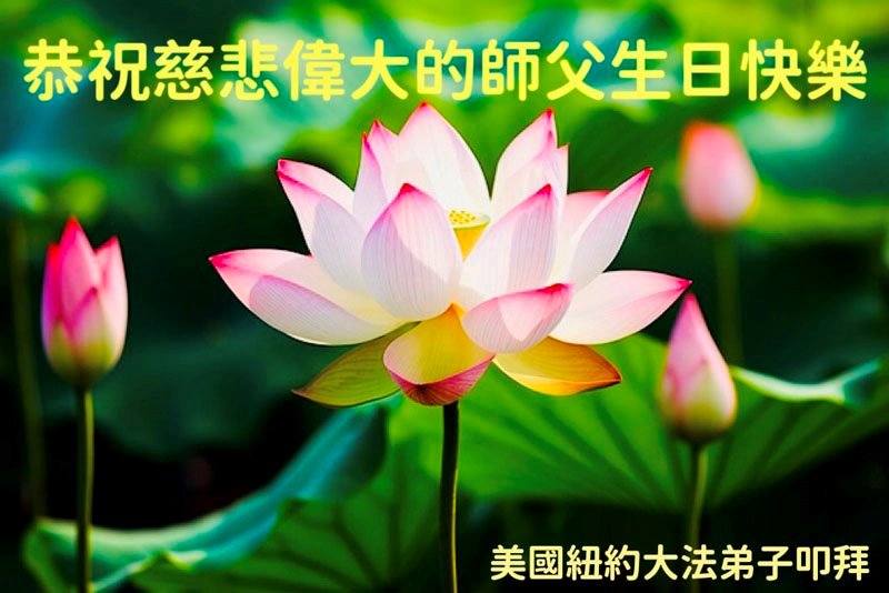 恭祝慈悲伟大的师尊生日快乐! 纽约飞天大学中城分校工程部全体大法弟子敬上 纽约中城一学法小组大法弟子恭祝慈悲伟大的师尊生日快乐!