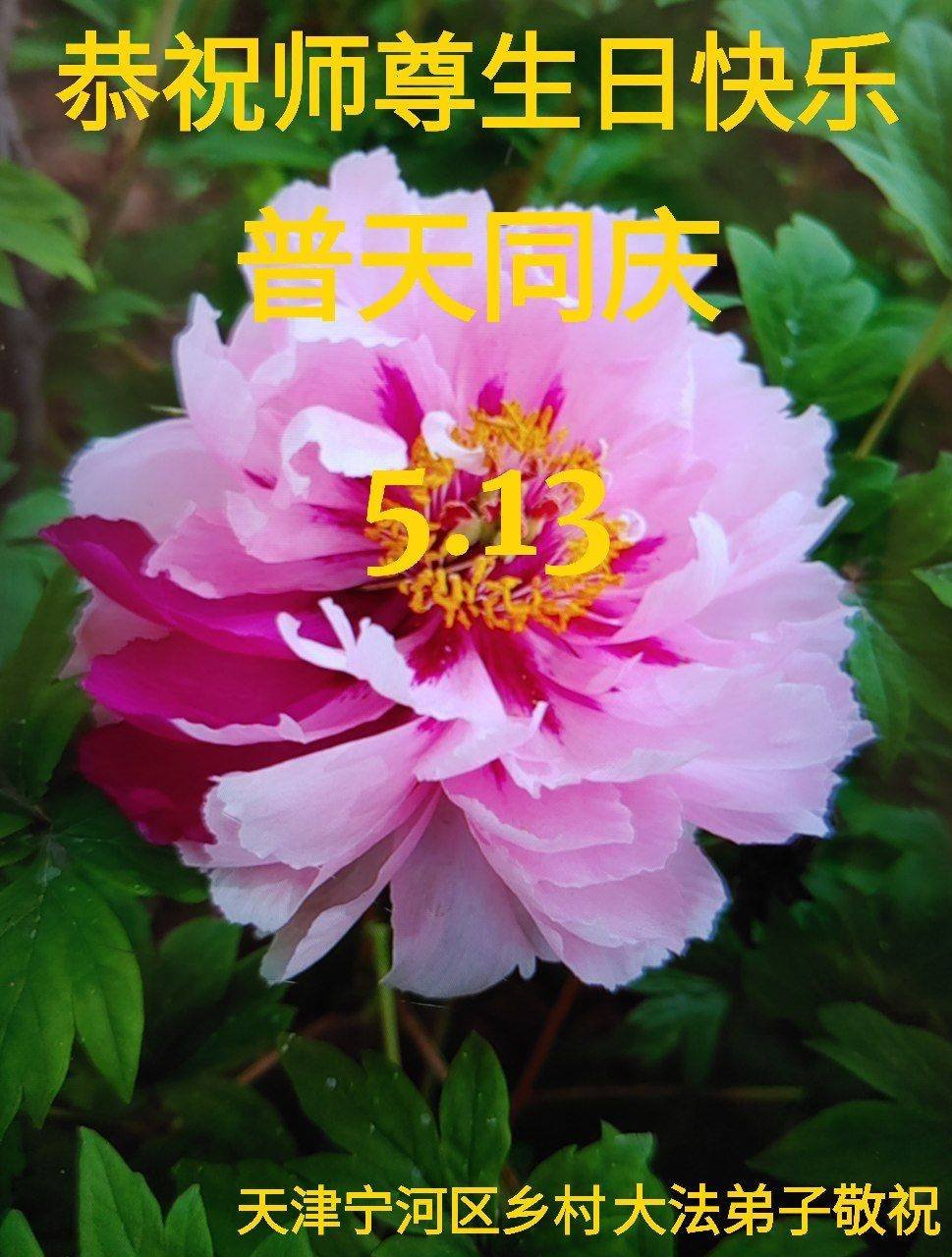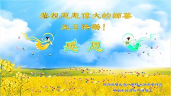 在这普天同庆同颂的五∙一三世界法轮大法日到来之际,黑龙江北安市乡镇及林业局全体大法弟子恭祝慈悲伟大的师父生日快乐!恭贺世界法轮大法日!用人类的任何语言都无法表达弟子们对师尊的感恩,唯有勇猛精進,学好法,尽快转变人的观念,整体配合,多救人,让师尊少一份操劳,多一份安慰,兑现誓约,圆满随师还。 吉林省长春市榆树市乡村夫妻弟子恭祝师尊生日快乐!同祝世界法轮大法日!