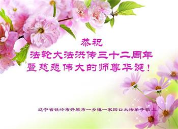 山东省青岛市农村一大法弟子及家人恭贺世界法轮大法日