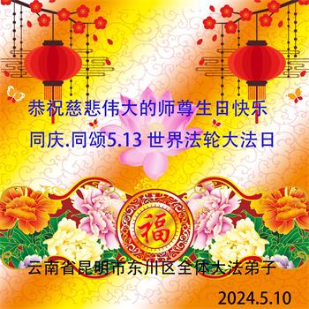恭祝慈悲伟大的师尊生日快乐! 师父:您辛苦了! 同庆、同颂5.13世界法轮大法日! 云南省昆明市东川区石羊村全体大法弟子 云南省昆明市一大法弟子恭祝师尊生日快乐!