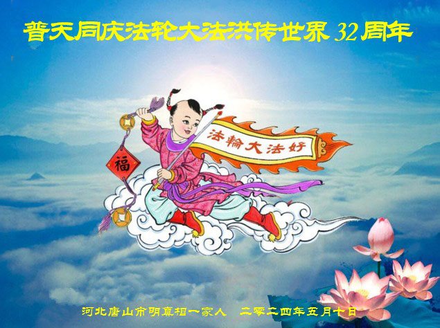 河北唐山市明真相一家人恭贺世界法轮大法日!普天同庆法轮大法洪传世界32周年!