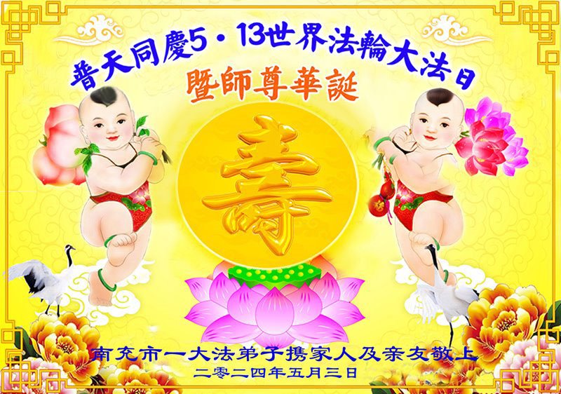 四川南充市一大法弟子携家人及亲友恭贺世界法轮大法日暨师尊华诞!