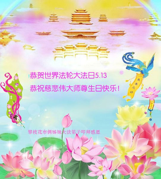 师父您辛苦了!弟子谢谢您的慈悲救度!弟子一定要听师父的话,坚修到底,跟师父回家。 四川省攀枝花姊妹俩大法弟子恭祝世界法轮大法日!恭祝慈悲伟大的师父生日快乐!