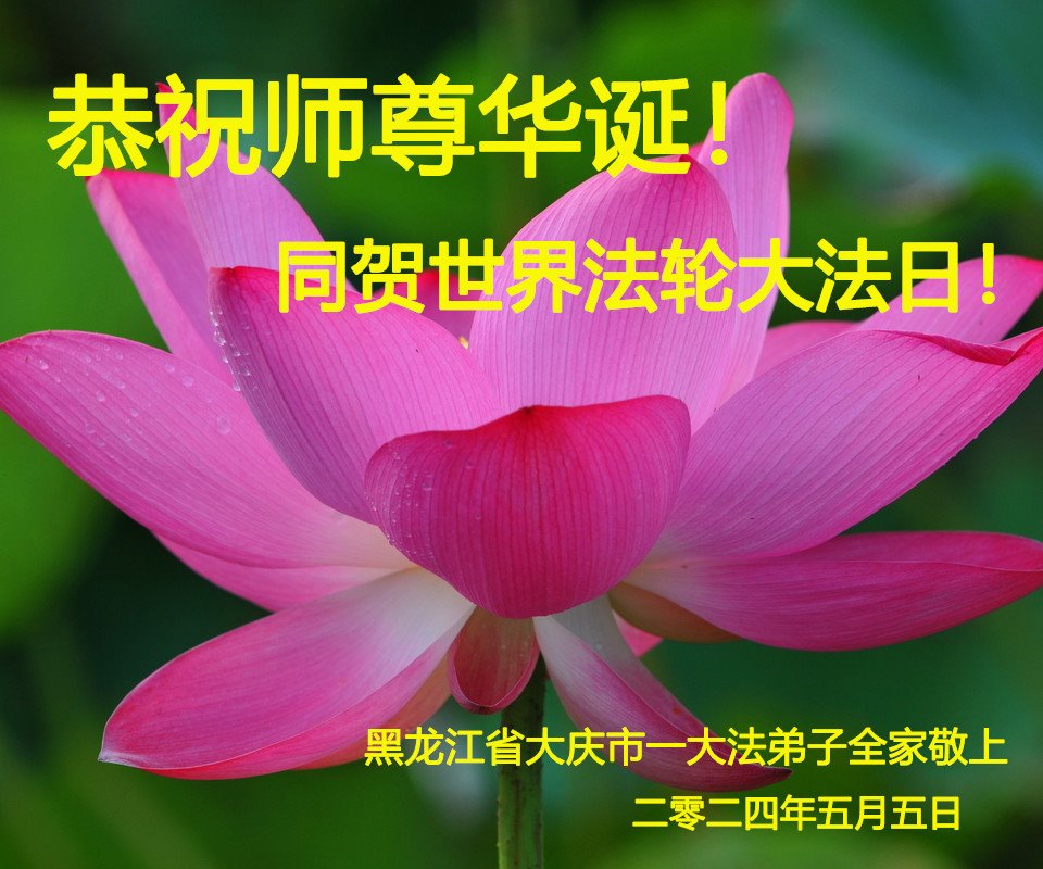 感谢师父的慈悲救度,法轮大法使弟子由一个原来道德低下、心胸狭窄、自私自利、疾病缠身的人,蜕变为道德高尚、为别人着想、身心健康的大法徒。近些年弟子在与世人的接触、交流讲真相中,切身感受到了世人由原来对大法及大法弟子的误解、憎恨、歧视,变为明白、敬佩、敬重,这是师尊何等巨大的承受与洪大的慈悲,这是大法神奇的法力。 在法轮大法洪传三十二周年暨慈悲伟大的师尊华诞之际,恭祝师尊生日快乐! 轮回辗转为法来 红尘魔炼脱人骸 圆容大法救世人 兑现誓约随师还 黑龙江大庆大法弟子敬上 二零二四年五月十日 黑龙江省大庆市红岗区一学法小组敬贺师尊华诞!