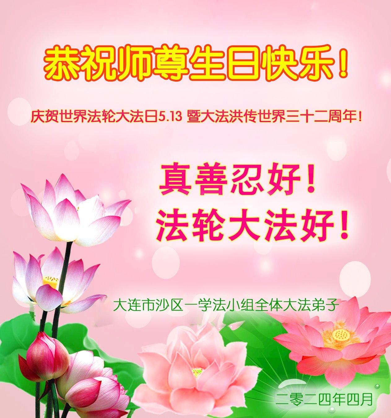 在“五·一三”这个寰宇大庆的日子里,弟子们恭祝慈悲伟大的师尊生日快乐!必定遵照师尊教诲,认真做好三件事,真正修好自己,救度众生,兑现誓约,完成历史使命,圆满随师还。 弟子们叩谢师尊救度之恩! 大连市沙区一学法小组全体大法弟子敬上 二零二四年四月 黑龙江省大庆市让胡路创业城一夫妻大法弟子恭祝师尊生日快乐!