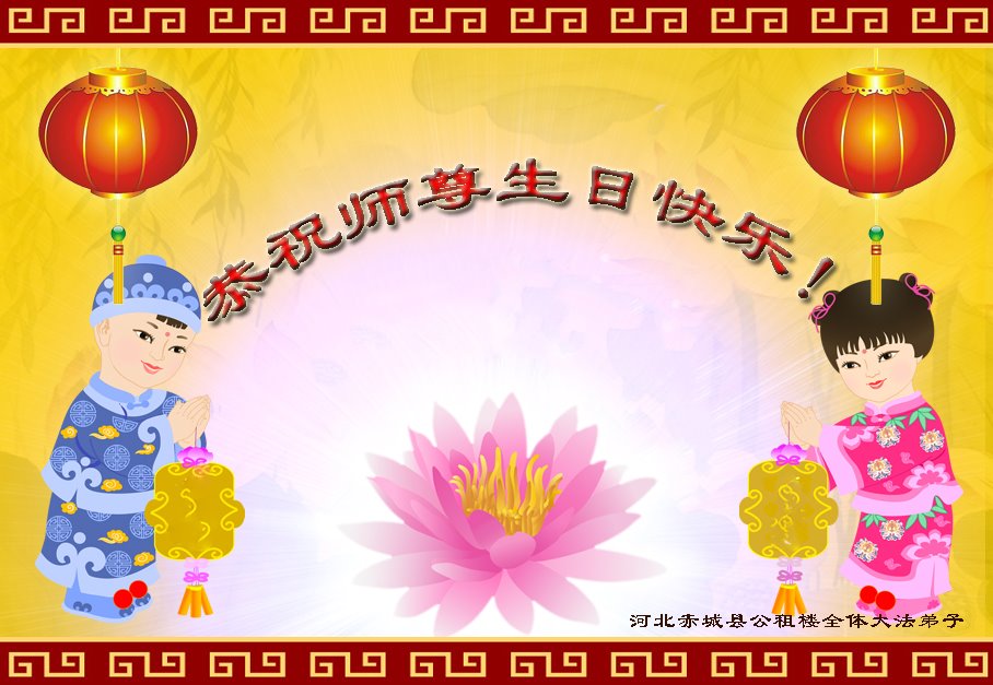 尊敬的师父祝您生日快乐! 我无比感恩师尊救度之恩!尤其去年年底救了我儿子的命,儿子也感激师父的无量慈悲!我们在今后剩下不多的时间里,做好三件事,救度更多的众生。 河北省张家口市赤城县一家四位大法弟子敬贺世界法轮大法日!
