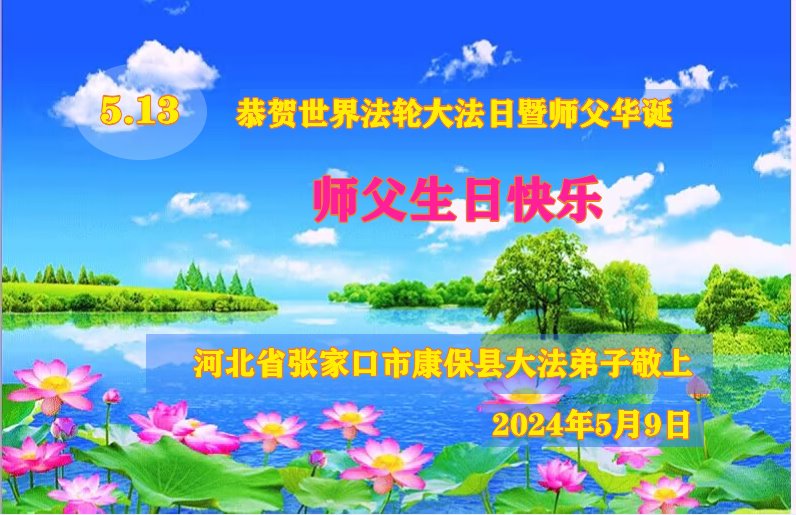 师父辛苦了。感恩师尊慈悲救度! 河北省蔚县大法弟子敬上 2024年5月10日 河北省张家口市康保县大法弟子敬贺世界法轮大法日!