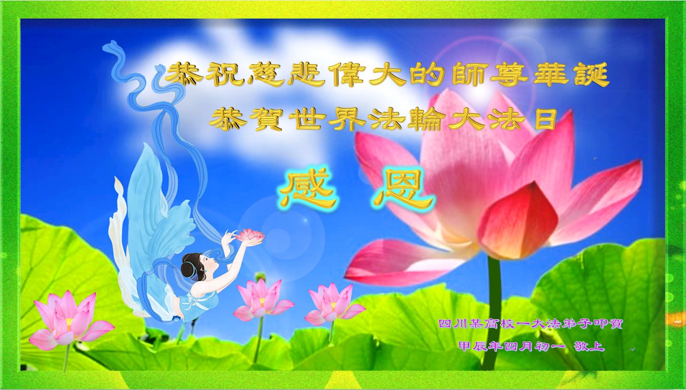 慈悲伟大的师父好!在这普天同庆的世界法轮大法日来临之际,我们教育系统全体大法弟子恭祝师尊华诞,敬贺法轮大法洪传世界三十二周年!感恩慈悲伟大的师尊! 四川省成都高校大法弟子恭祝师尊华诞暨世界法轮大法日!