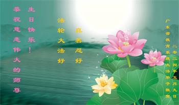 慈悲伟大的师尊:您好!弟子恭祝师尊生日快乐! 弟子深知做好三件事的重要,救人责任的重大!弟子只有多学法,找自己不足,修好自己,多救众生,勇猛精進,圆满随师还! 广东省广州教师大法弟子恭祝师尊生日快乐!恭贺世界法轮大法日!恭贺法轮大法洪传三十二周年!