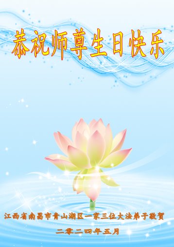 值此“五·一三“师尊华诞暨世界法轮大法日来临之际,弟子携家人恭祝慈悲伟大的师尊生日快乐!师尊,您辛苦啦,弟子叩拜师尊! 江西省景德镇市一大法弟子敬上 二零二四年五月十日 江西省九江市郊区大法弟子恭祝慈悲伟大的师尊生日快乐!普天同庆世界法轮大法日!