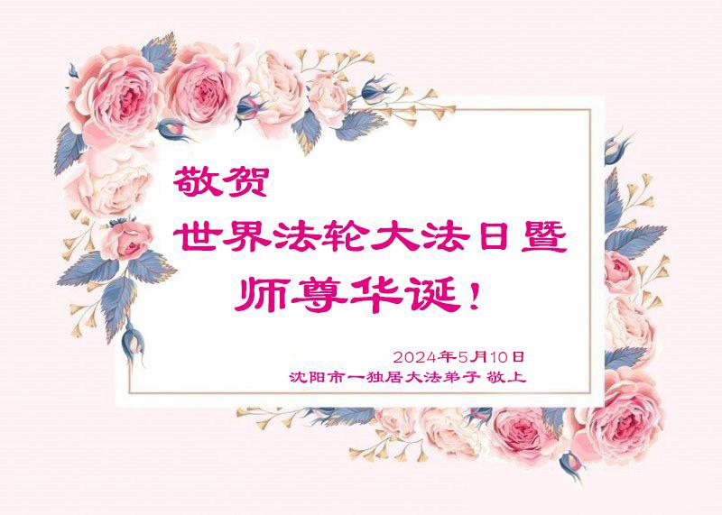 恭贺普天同庆世界法轮大法日!感恩师父这些年的慈悲保护和救度! 法轮大法好,真善忍好。 辽宁省沈阳市沈北新区虎石台地区一大法弟子家属跪拜 二零二四年五月九日 辽宁省沈阳市沈北新区虎石台地区一大法弟子家属恭祝师尊生日快乐!