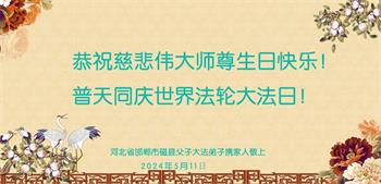 河北大法弟子敬上 2024年5月9日 河北省邯郸市武安市夫妻大法弟子庆贺世界法轮大法日暨慈悲伟大的师尊华诞!
