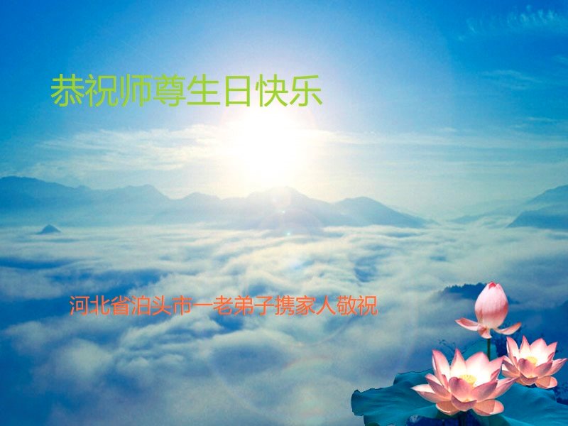 师父您辛苦了! 河北省泊头市一大法弟子敬上 河北省沧州市东光县大法弟子恭祝慈悲伟大的师尊生日快乐!同庆世界法轮大法日!
