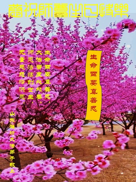 生命需要真善忍, 同化大法处处春。 浩荡恩泽创世主, 无量慈悲泽洪恩。 山东省潍坊市寿光市一学法小组大法弟子恭祝师尊生日快乐!同庆世界法轮大法日!同颂大法洪传世界三十二周年!