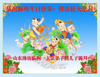山东潍坊临朐一大法弟子携儿子敬上 山东潍坊临朐一学法小组大法弟子恭祝师尊生日快乐!庆祝世界法轮大法日!