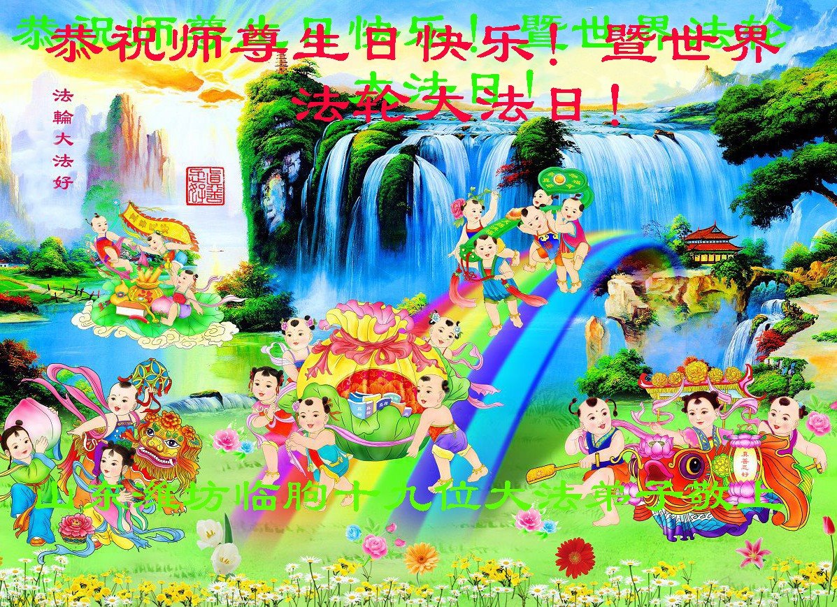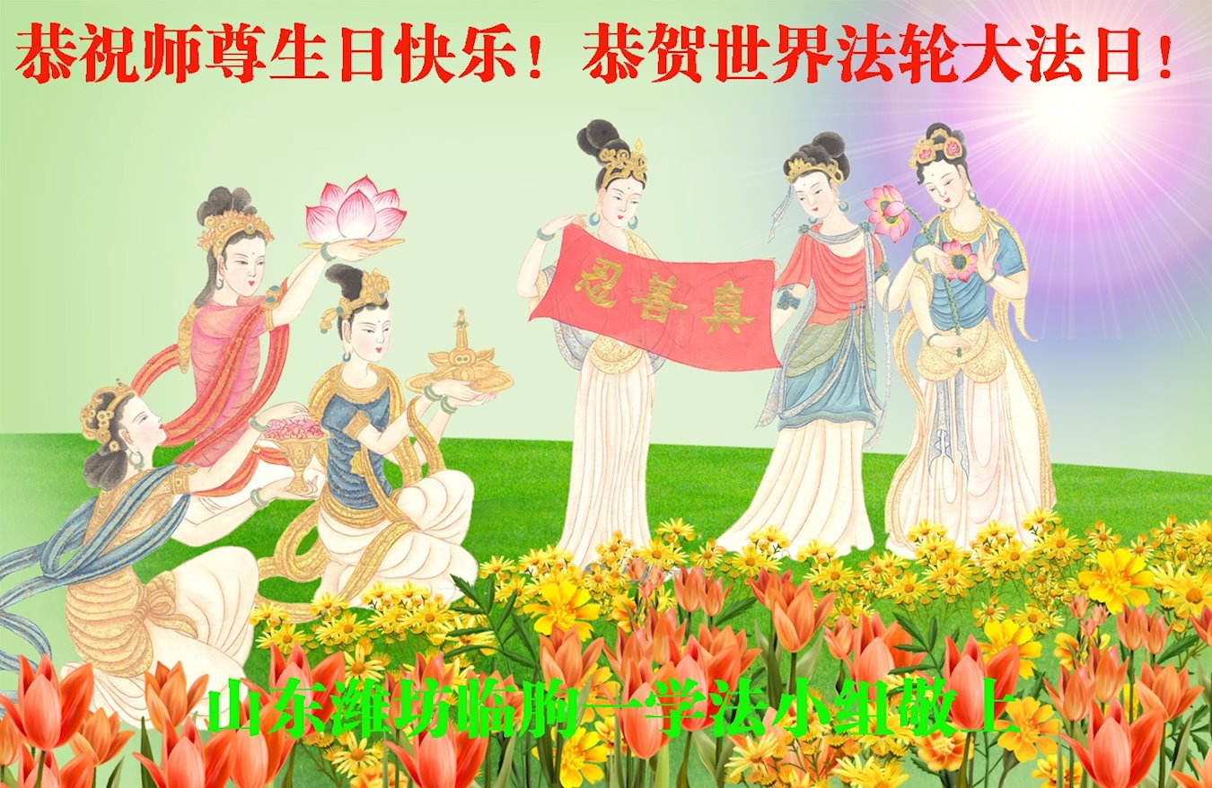 山东潍坊临朐一学法小组大法弟子敬上 山东潍坊临朐十九位大法弟子恭祝师尊生日快乐!庆祝世界法轮大法日!
