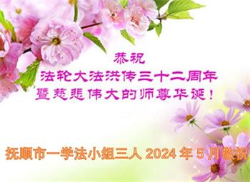 弟子一定要多学法、多背法、同化大法,做好三件事,做一名真修弟子,跟师父回家。 辽宁省鞍山市铁西区一小花真相组6人敬上 二零二四年五月九日 辽宁抚顺市大法弟子恭贺师尊华诞暨世界法轮大法日!