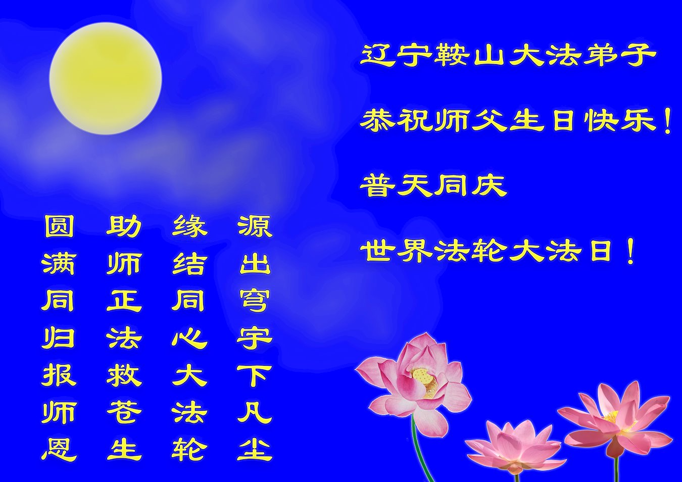 祝师尊生日快乐!感恩师尊慈悲救度。 辽宁省鞍山一大法弟子家属敬上 辽宁省鞍山市一大法弟子及家人敬贺世界法轮大法日!