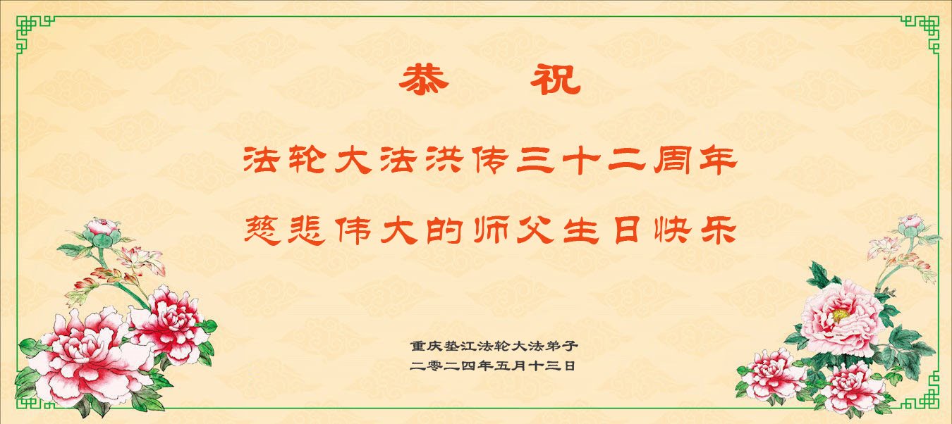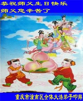 师父好!恭祝师父生日快乐!感恩师父慈悲救度之恩! 重庆九龙坡区一大法弟子敬上 重庆市九龙坡区三大法弟子恭祝法轮大法洪传三十二周年暨慈悲伟大的师尊华诞!