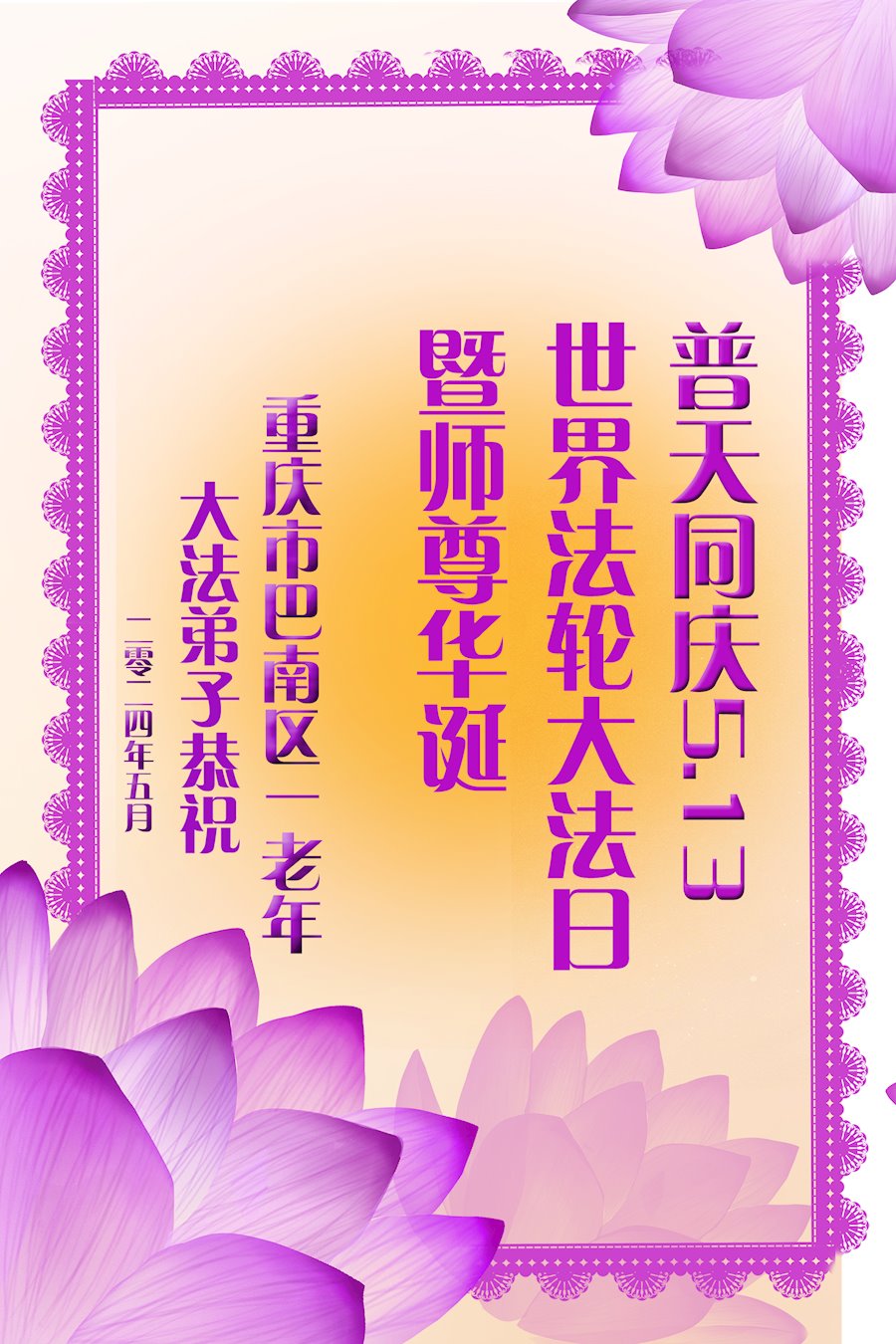 【明慧网二零二四年五月十四日】 重庆市巴南区一老年大法弟子祝贺世界法轮大法日暨师尊华诞!