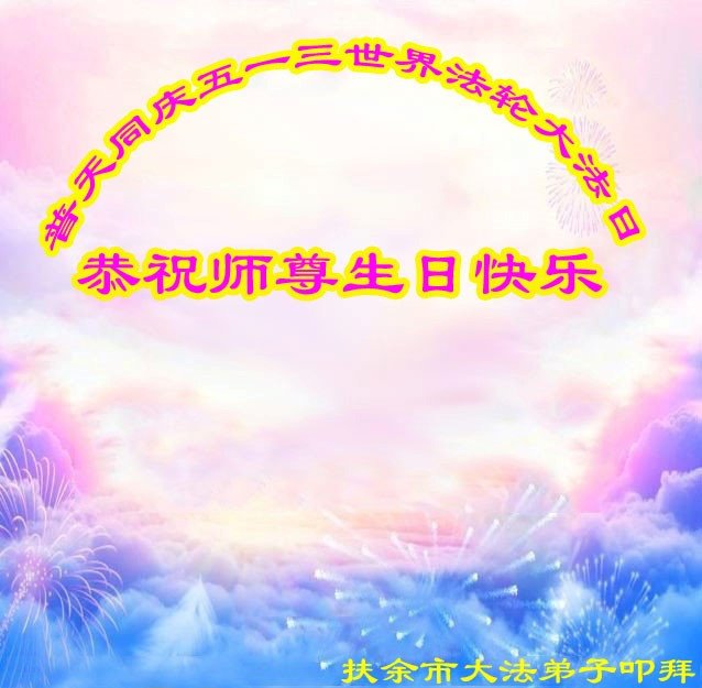 五∙一三鼓乐震天 洪恩荡澈天宇 慈悲救众生 弟子谢师恩 不弃引迷途 唯有再精進 回报救度恩 扶余市大法弟子叩拜 二零二四年五月十日 吉林省大法弟子及家人恭祝慈悲伟大的师父生日快乐!普天同庆世界法轮大法日!
