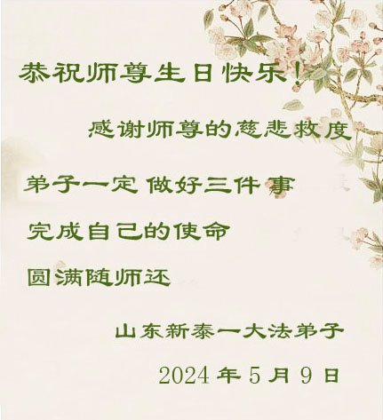 【明慧网二零二四年五月十四日】 山东省东营市大法弟子恭祝师父生日快乐!