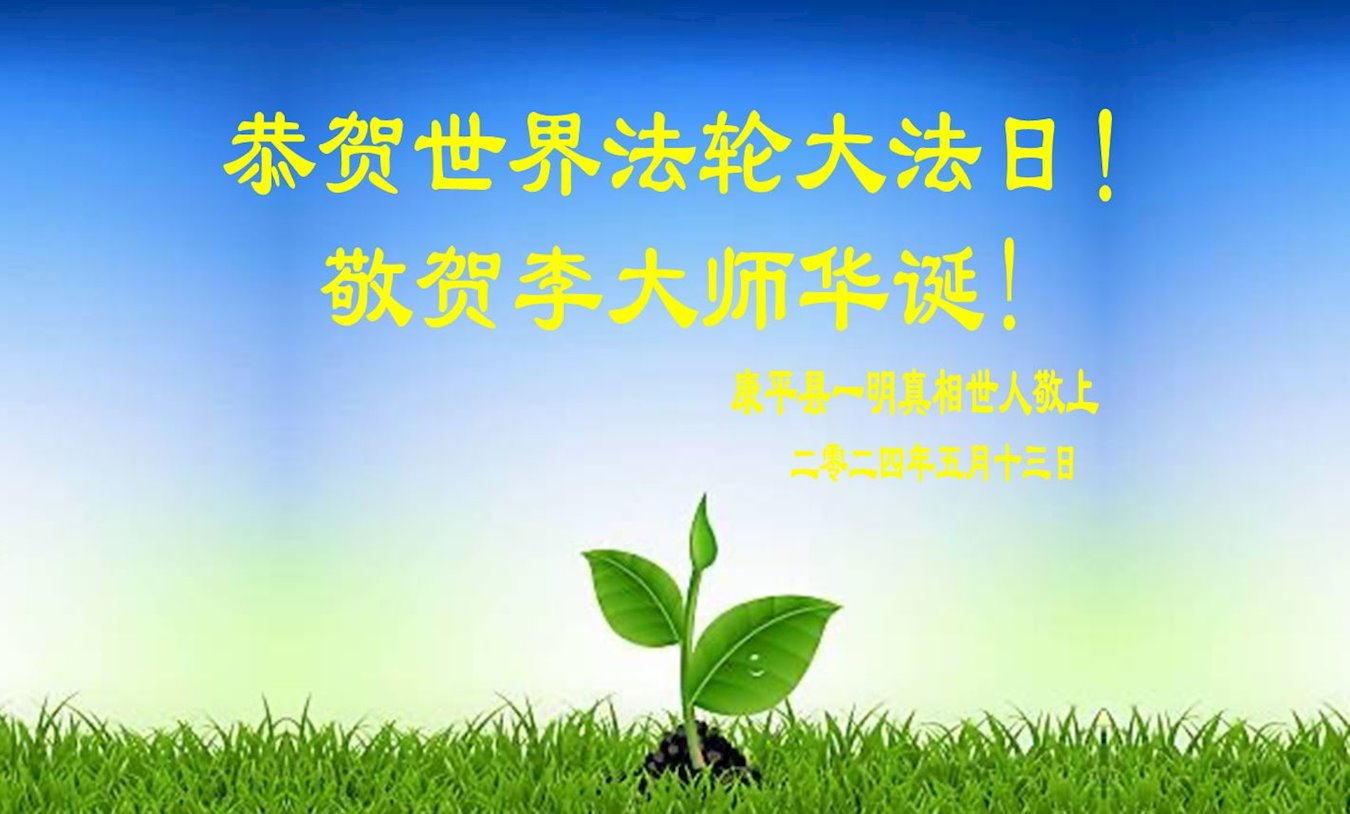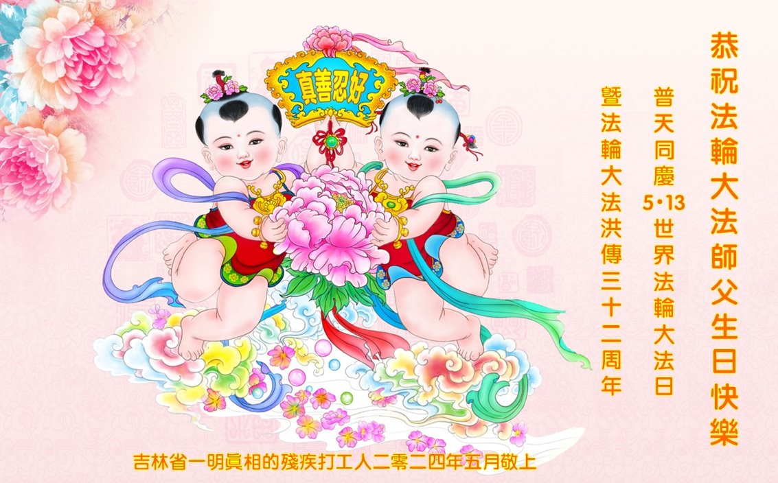 敬贺世界法轮大法日! 安徽省合肥市一大法弟子和明真相的家人敬贺 二零二四年五月十一日 吉林省一明真相的残疾打工人恭祝法轮大法师父生日快乐!