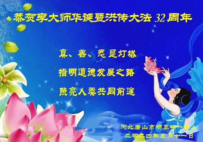 我有幸拜读李大师《为什么会有人类》和《为什么要救度众生》这两篇经文之后,我感到我是一个多么幸运的人,有幸生在当今,有幸聆听李大师教诲。我悟到我就是李大师要救度的亲人。李大师的“亲人”何等的亲切,我感恩!我感恩李大师的洪恩浩荡!我感恩李大师的救度之恩! 河北省唐山市明真相人士恭祝李大师生日快乐!